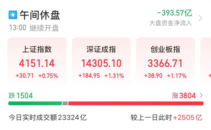 1月12日早盘,A股主要指数集体上涨。截至午间收盘,上证指数涨0.75%,深证成指涨1.31%,创业板指涨1.17%,科创综指涨2.46%,北证50指数涨4.20%。沪深北三市半日成交额再度突破2万亿元,达23324亿元。