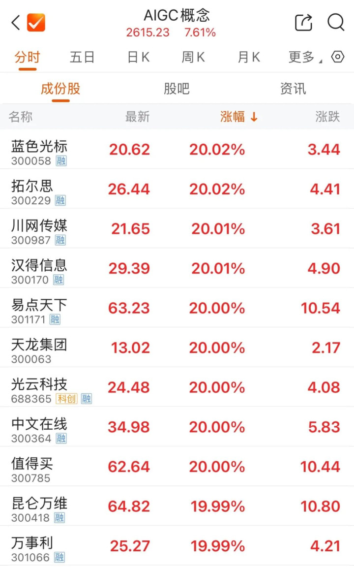 早盘,AI应用方向集体大涨,Kimi概念、Sora概念涨幅居前。截至午间收盘,易点天下、中文在线、值得买、蓝色光标、拓尔思、昆仑万维等多股以20%幅度涨停,万兴科技、因赛集团涨超10%。此外,引力传媒开盘“一字涨停”,走出6天5板。